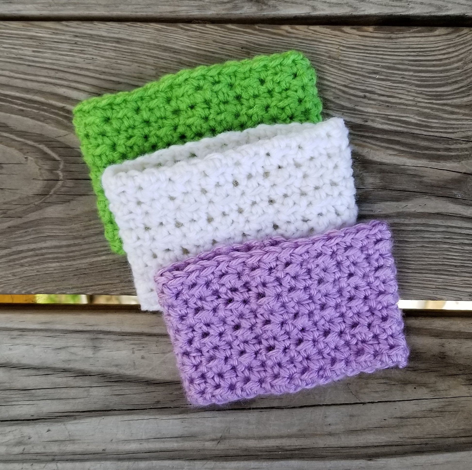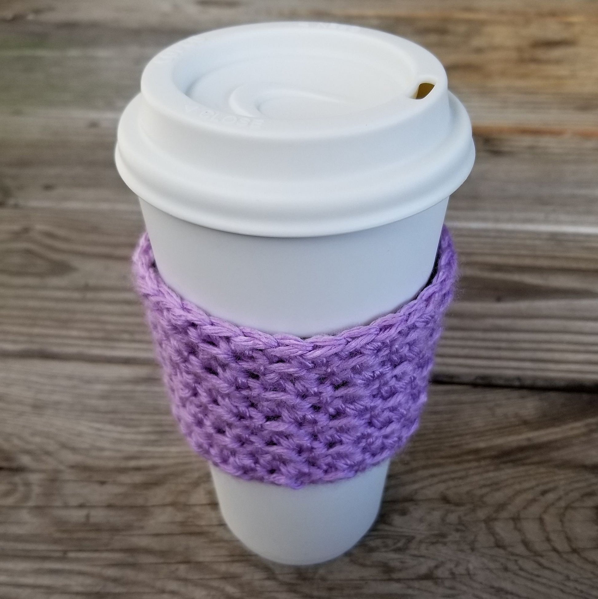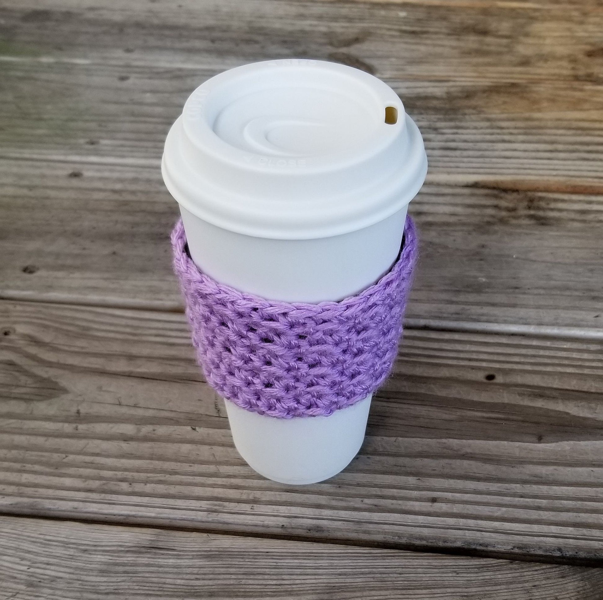 This textured coffee cup cozy pattern is easy to read and works up quickly. It is a great use for scrap yarn.