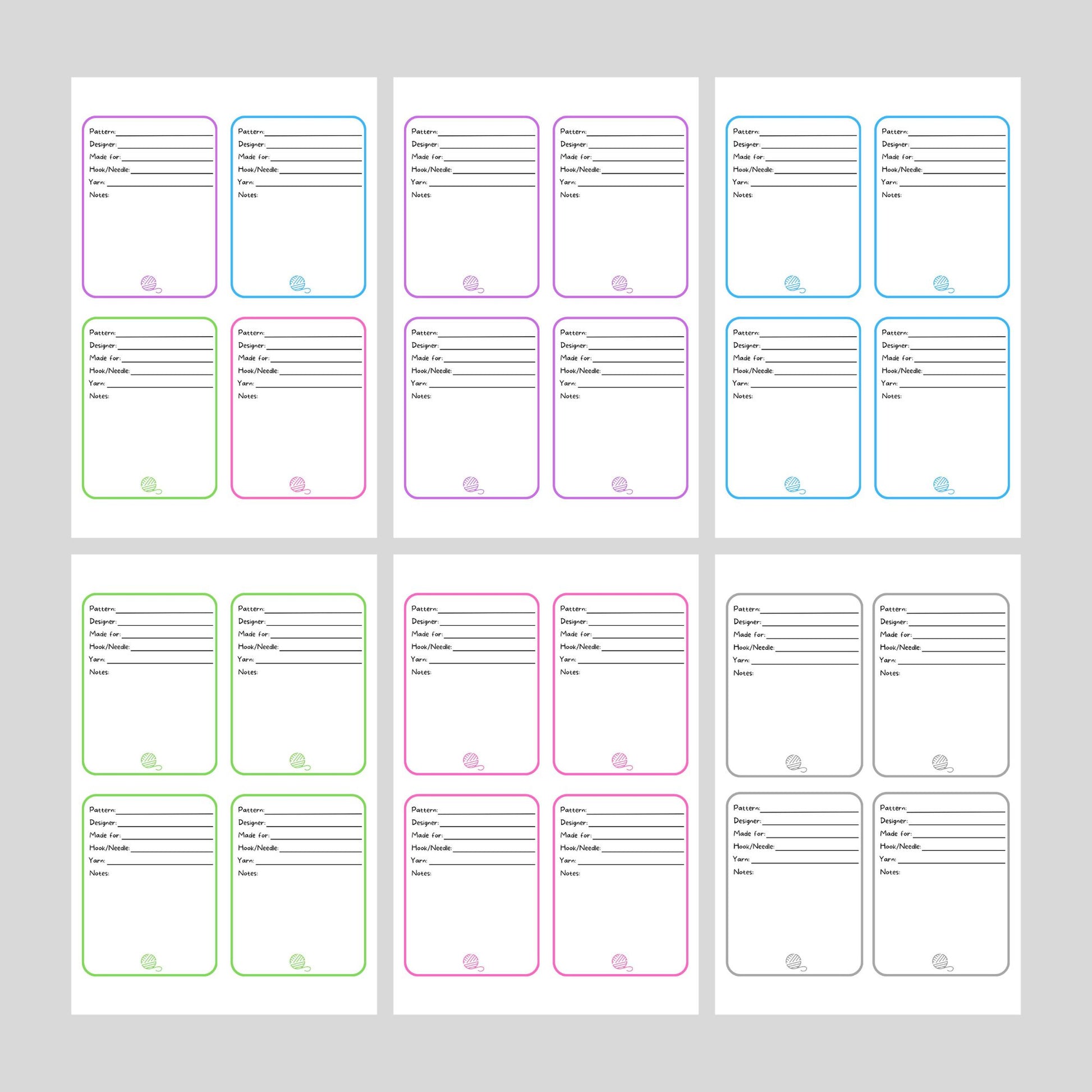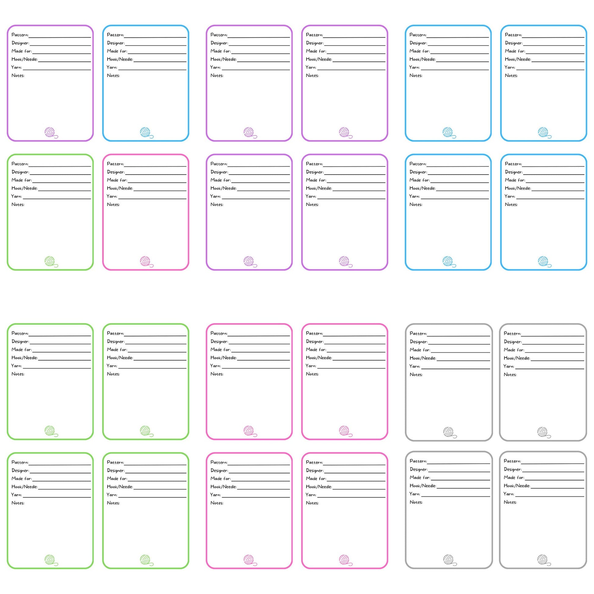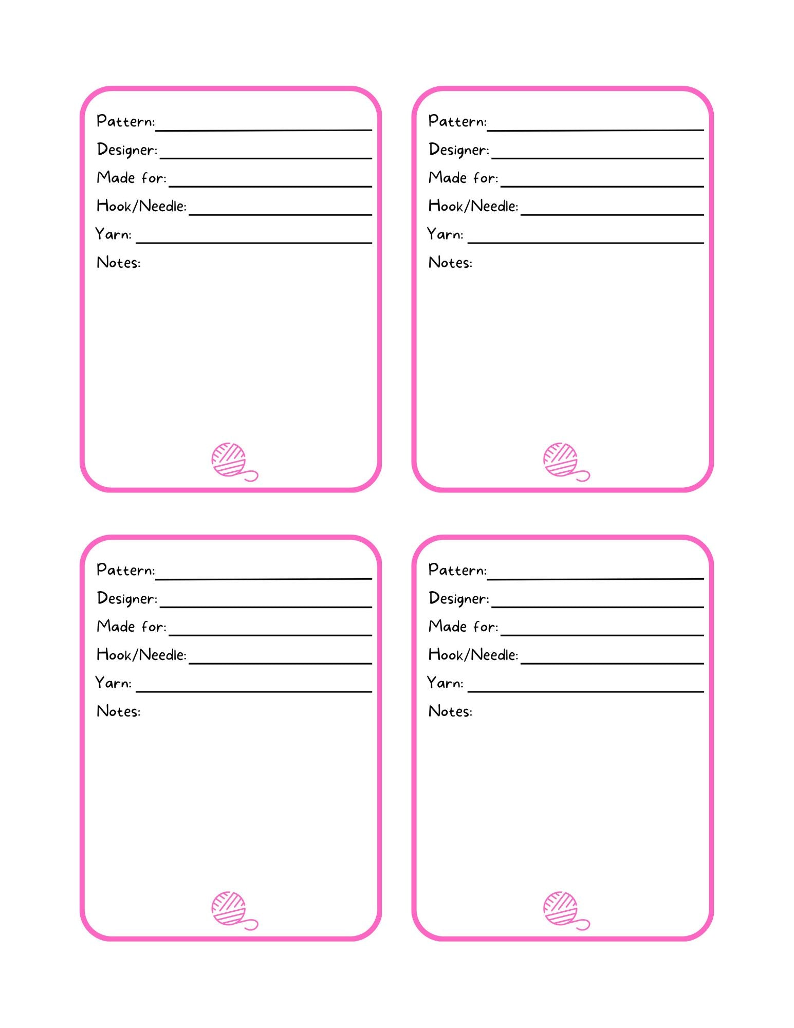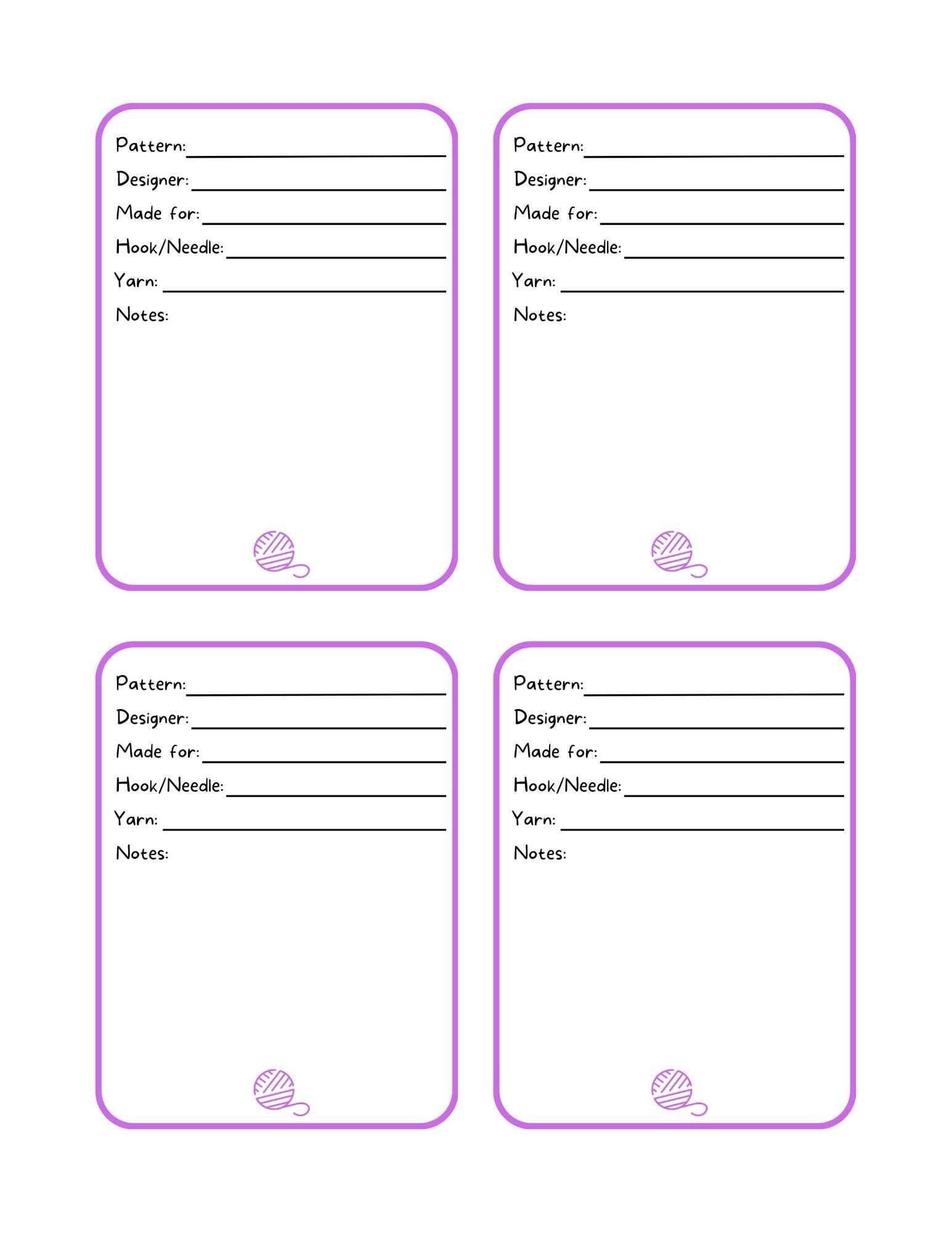 Print it out, cut the cards, fill in the information and place the card with the project. No more need to remember what yarn, hook or needle, or what pattern you used when you return to your project.